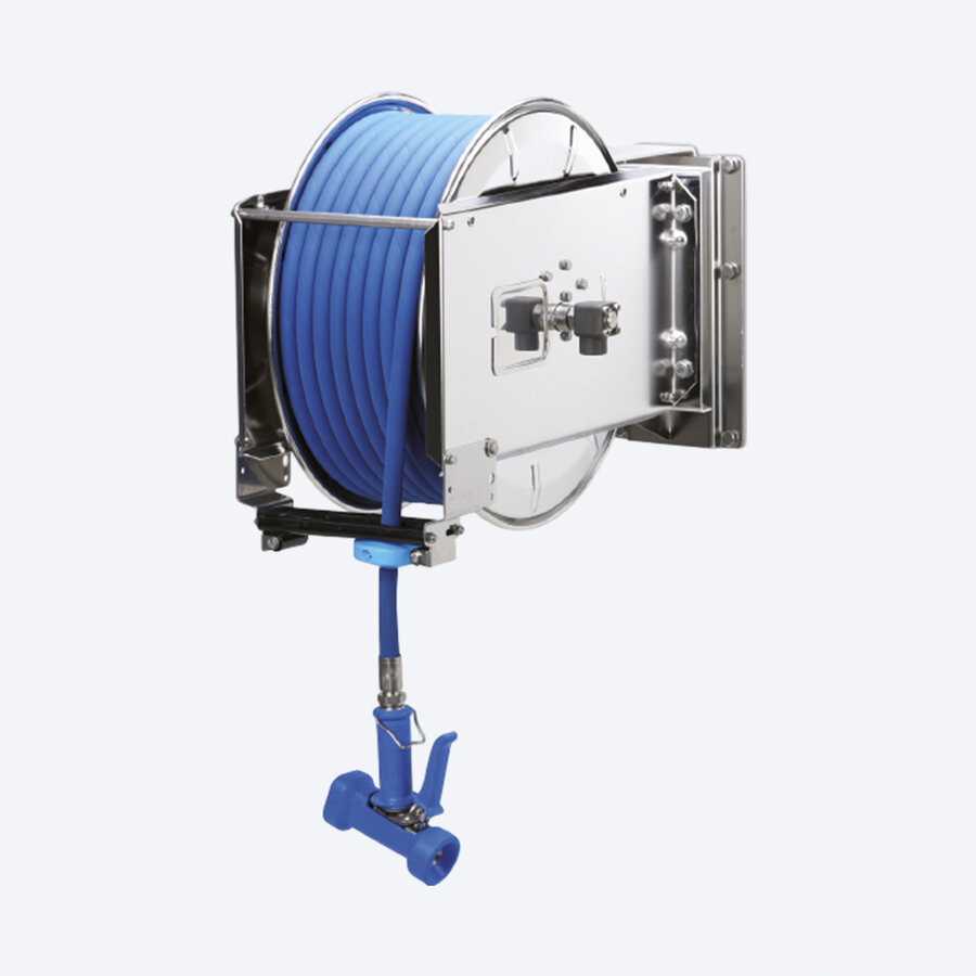 Robuster Schlauchaufroller mit automatischem Federrückzug, ideal für nasse Umgebungen oder Hygienebereiche. Das Edelstahlgehäuse ist korrosionsbeständig, die Trommellagerung erfolgt über wartungsfreie Kunststoffgleitlager. Der Schlauch lässt sich in 8 Rastpositionen arretieren und mit einem kurzen Zug lösen. Winkeldrehgelenke aus Edelstahl und PTFE/EPDM-Dichtungen gewährleisten sichere, langlebige Funktion.